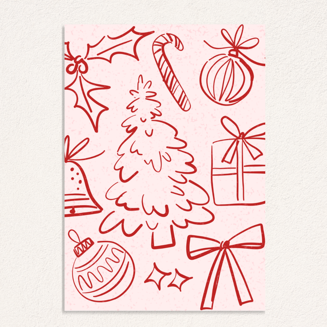 Deze vrolijke kerstkaart met rode illustraties is perfect voor iedereen die houdt van een speelse en moderne kerststijl. De kaart staat vol met handgetekende kerstelementen zoals een kerstboom, cadeautje, kerstballen, een strik, hulstbladeren en een candy cane. De rode lijnen op de zachte roze achtergrond geven de kaart een warme en trendy uitstraling.