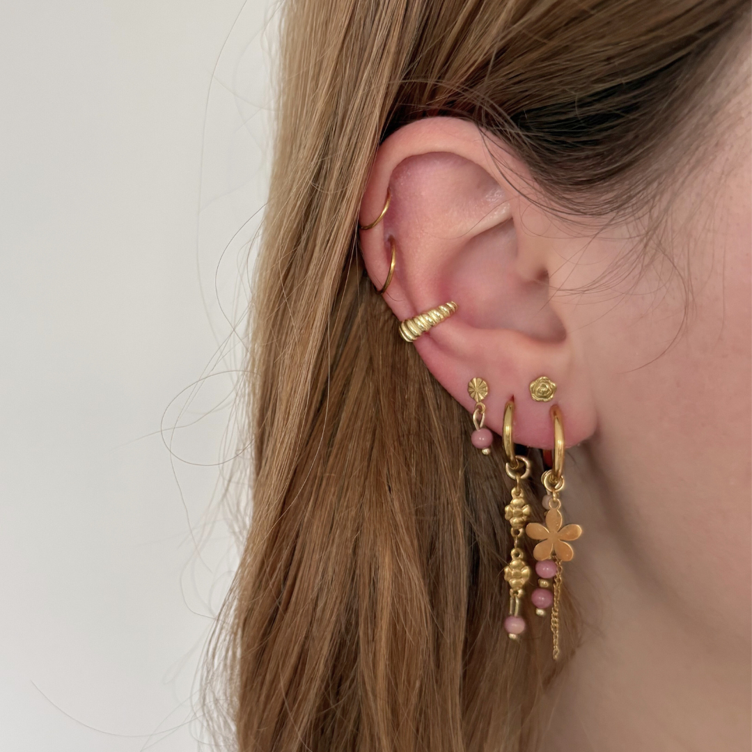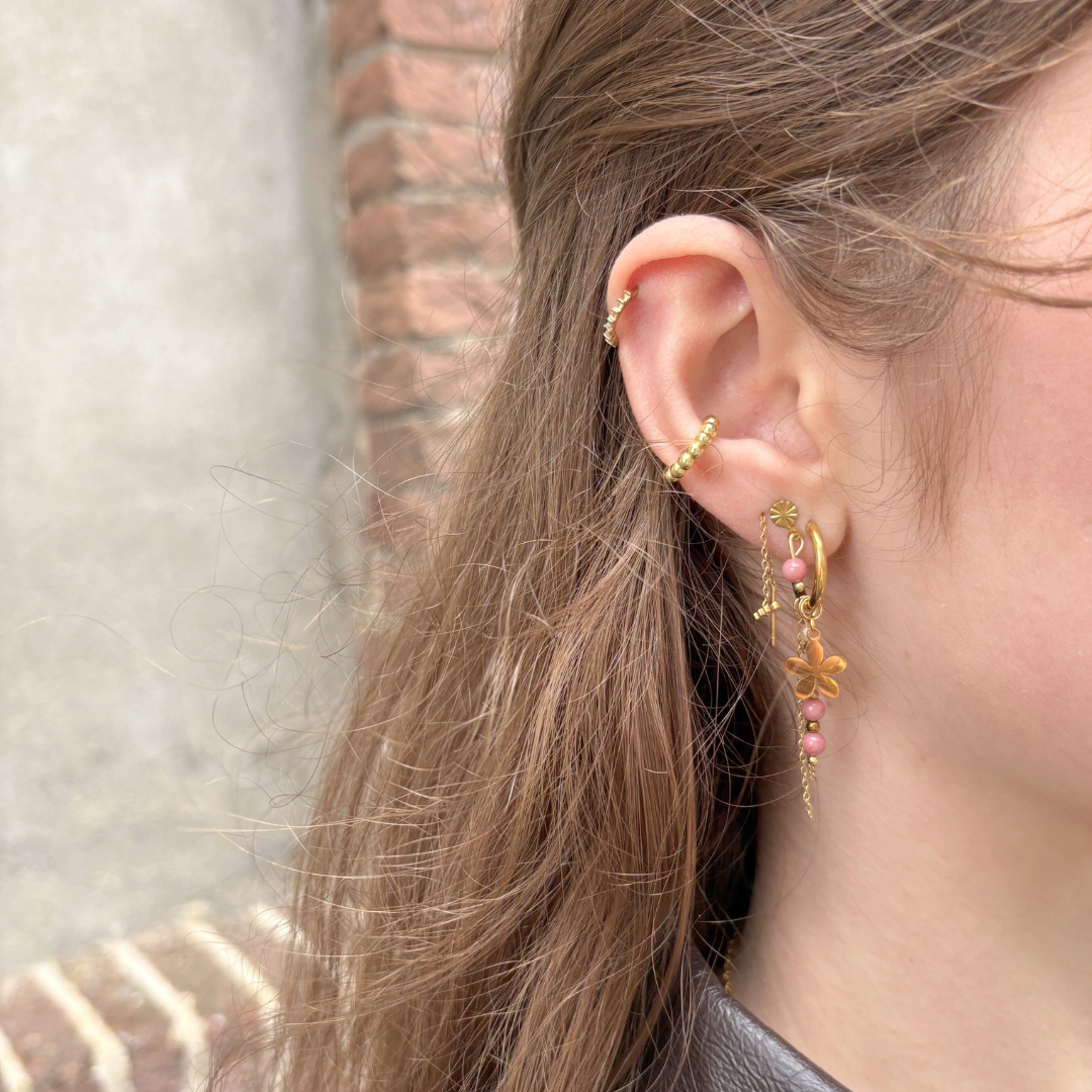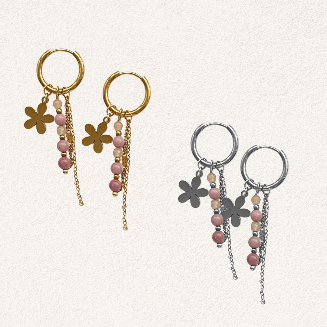 Deze speelse oorbellen combineren een stainless steel hoop met kleine kralen van rhodoniet natuursteen, een bloem bedel en fijne kettinkjes. De oorbellen worden met de hand gemaakt in ons atelier in Middelburg, waardoor ieder paar een uniek karakter heeft.