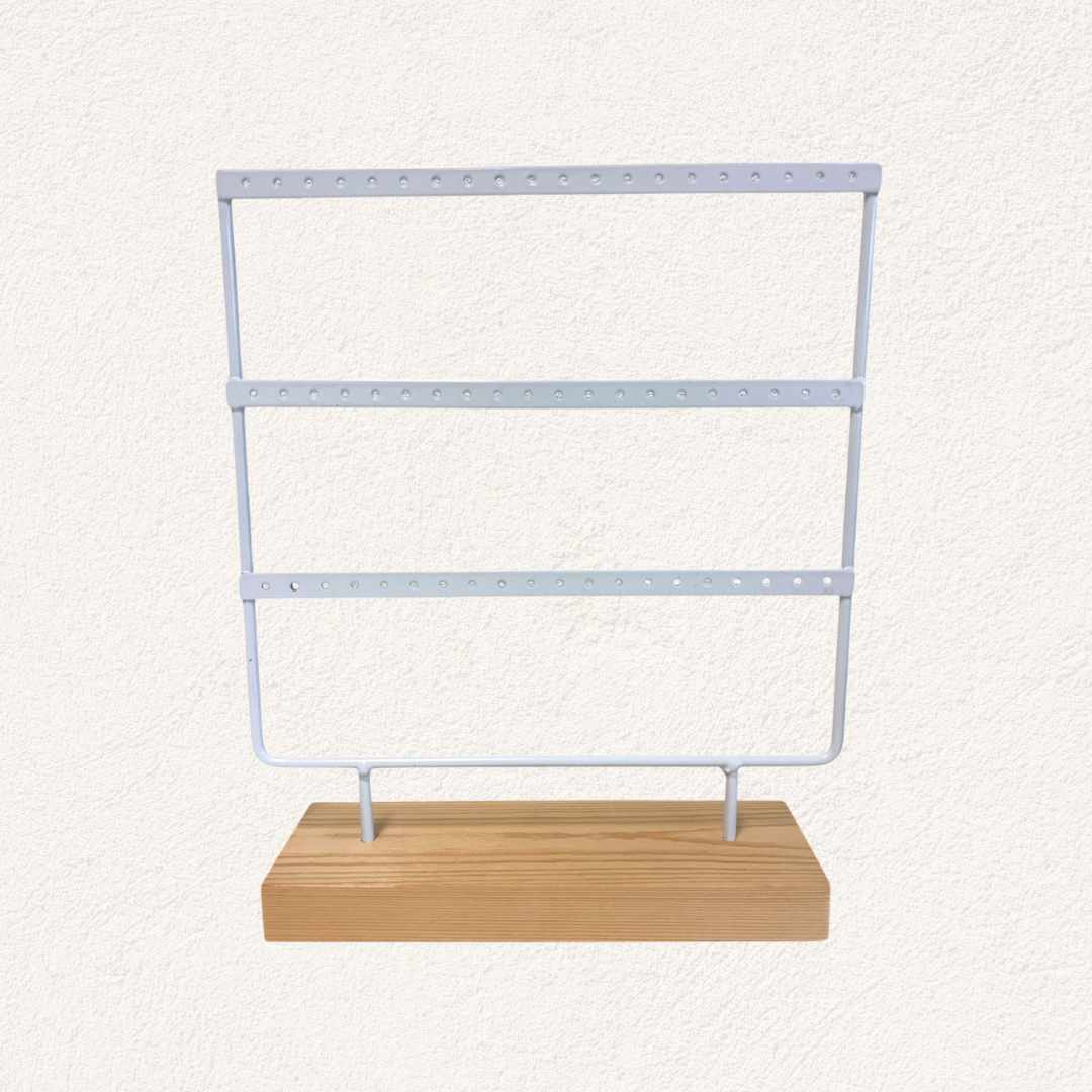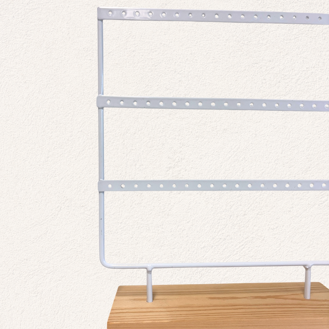 De display heeft drie rijen met gaatjes, waardoor je meerdere paar oorbellen overzichtelijk kunt ophangen. Ideaal voor het uitstallen van sieraden in een winkel, op een markt, of gewoon voor thuis op je kaptafel.