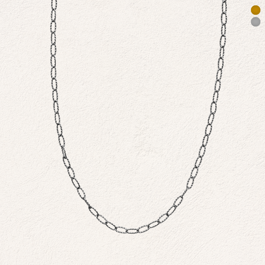 Deze ovale schakel ketting heeft een verfijnde en rustige uitstraling door de langwerpige, ovale schakels. Het ontwerp oogt licht en elegant, waardoor de ketting mooi tot zijn recht komt als basis of in combinatie met andere kettingen en charms.