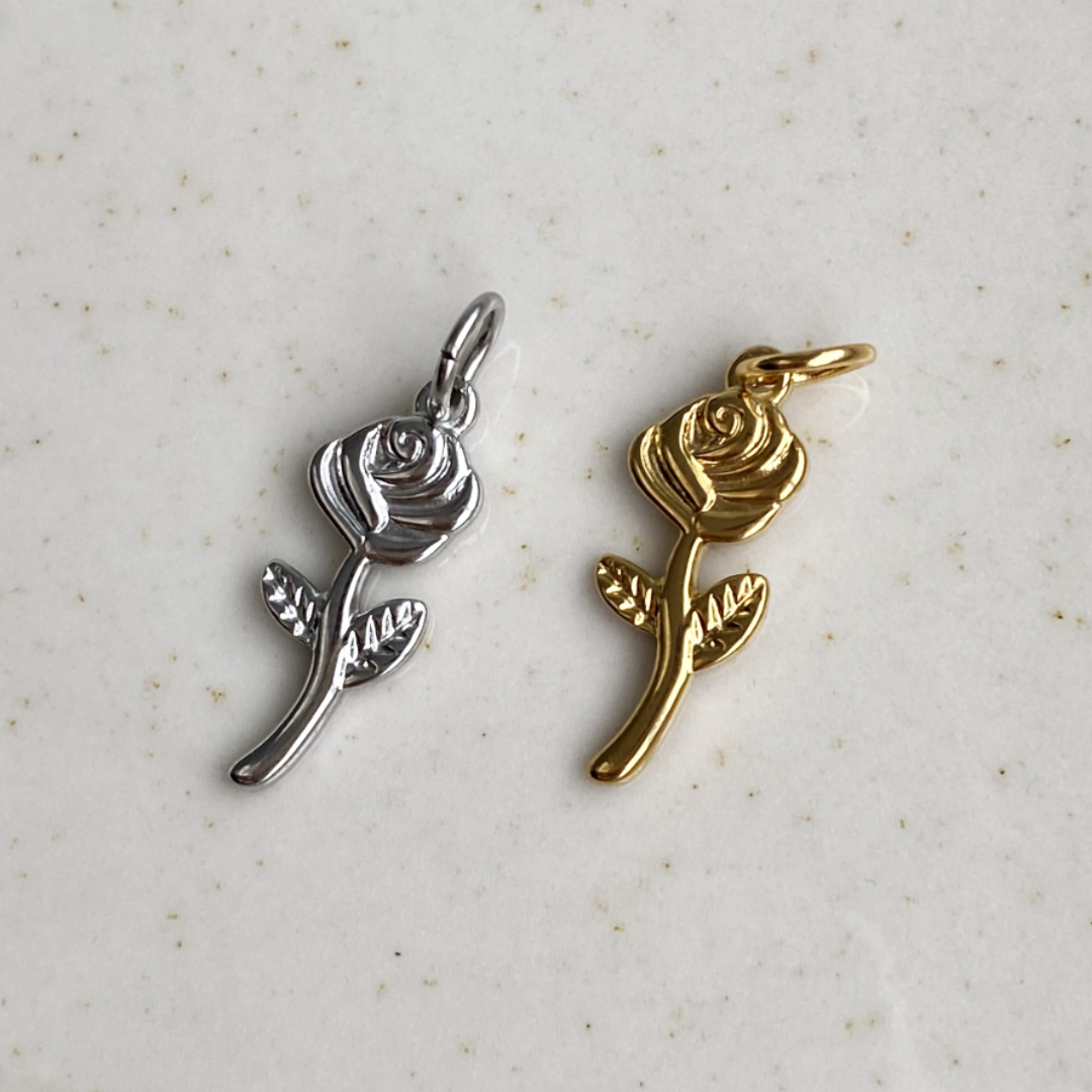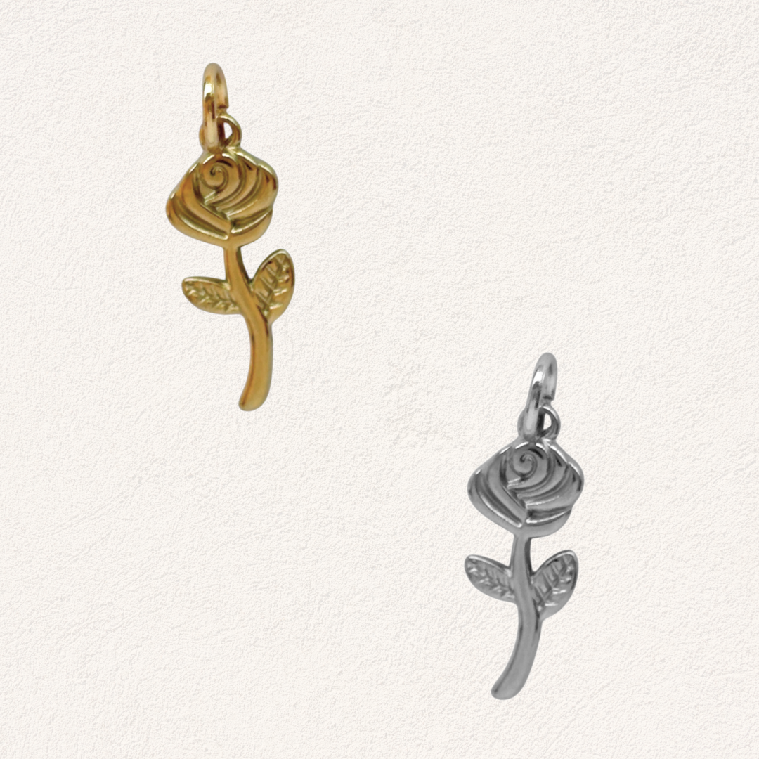 Deze stainless steel bedel in de vorm van een roos is een mooie toevoeging aan je ketting of armband. Het gedetailleerde ontwerp van de bloem en blaadjes geeft de bedel een herkenbare, sierlijke vorm die makkelijk te combineren is met andere bedels.