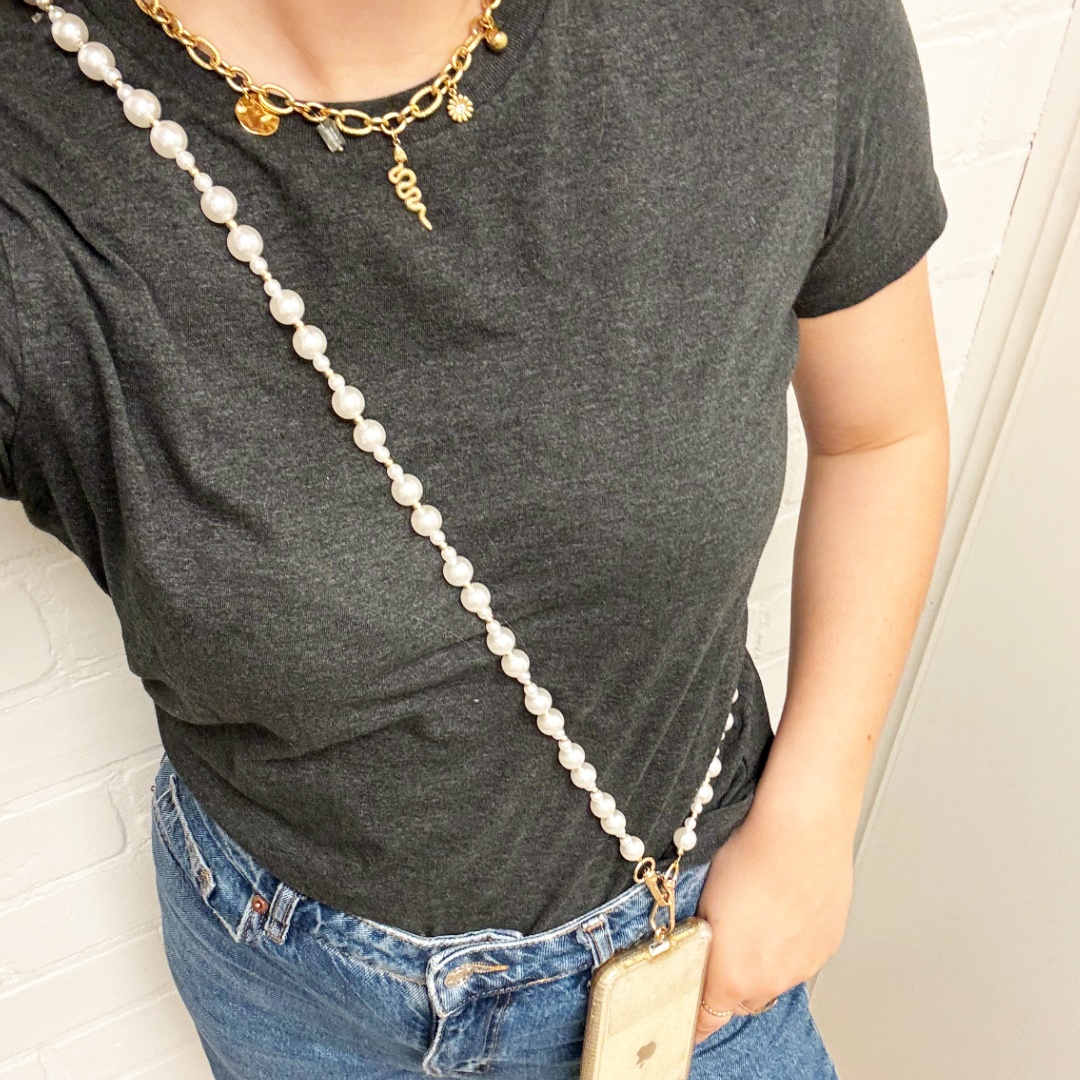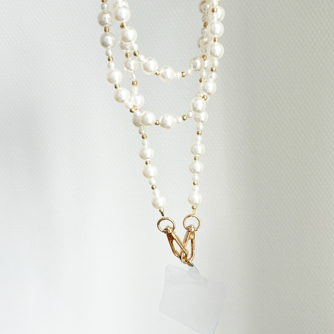 Maak je outfit helemaal af met onze toffe telefoonkoorden! De (nep) parels geven je outfit een beetje extra glam. Voor dit telefoonkoord heb je geen speciaal hoesje nodig, er zit namelijk een plastic lanyard pad bij die je in je eigen hoesje kan stoppen. Ga voor trendy, ga voor parels!